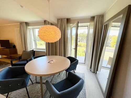 - großes Wohnzimmer mit Meerblick, Wohnmöbeln und Flachbild-TV