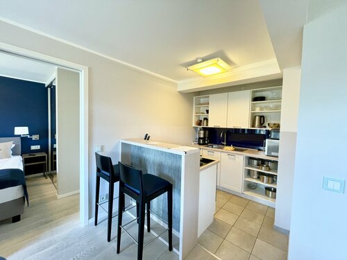 - offene Küche mit Vollausstattung (Herd mit Kochfeld, Kühlschrank, Geschirrspüler, Mikrowelle, Kaffeemaschine, Wasserkocher, Toaster sowie Geschirr und Besteck)